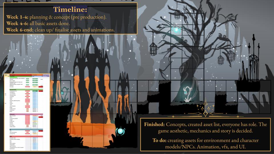 - Games design didn’t bring much work to show us just the level one and two layout on paper, so we decided to give them a clear task list to give them objectives to achieve and show us for the next meeting. This would help clarify a lot of things about the game mechanics making us feel more confident to progress in work.