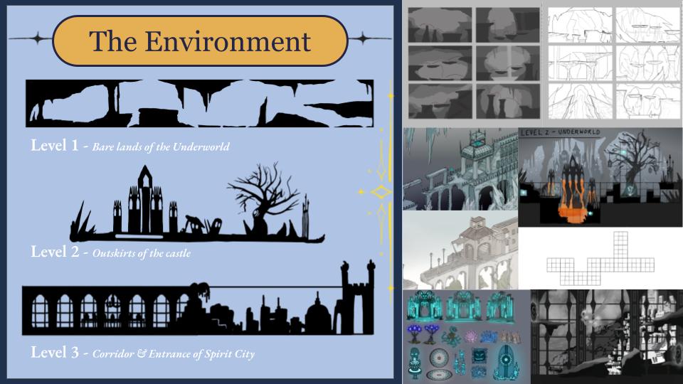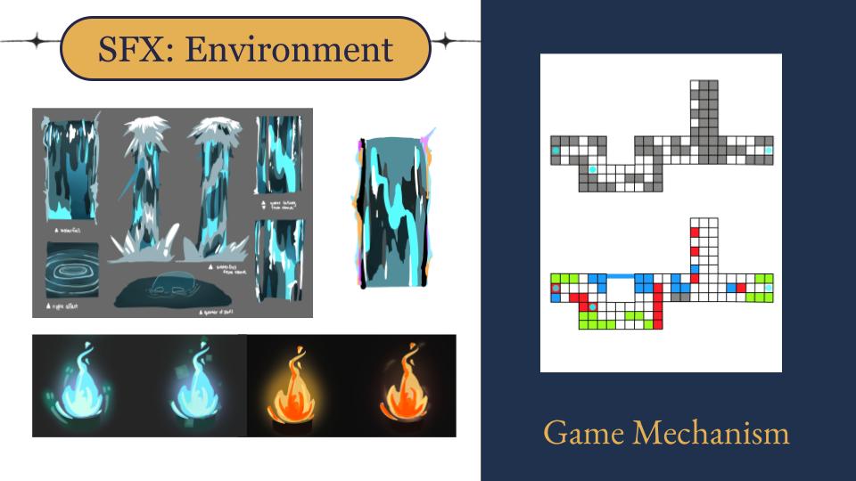 - VFX : sprite sheet for environment e.g. like lava and waterfall; animation for the teleportation + trail for the character (texture + parameters)
